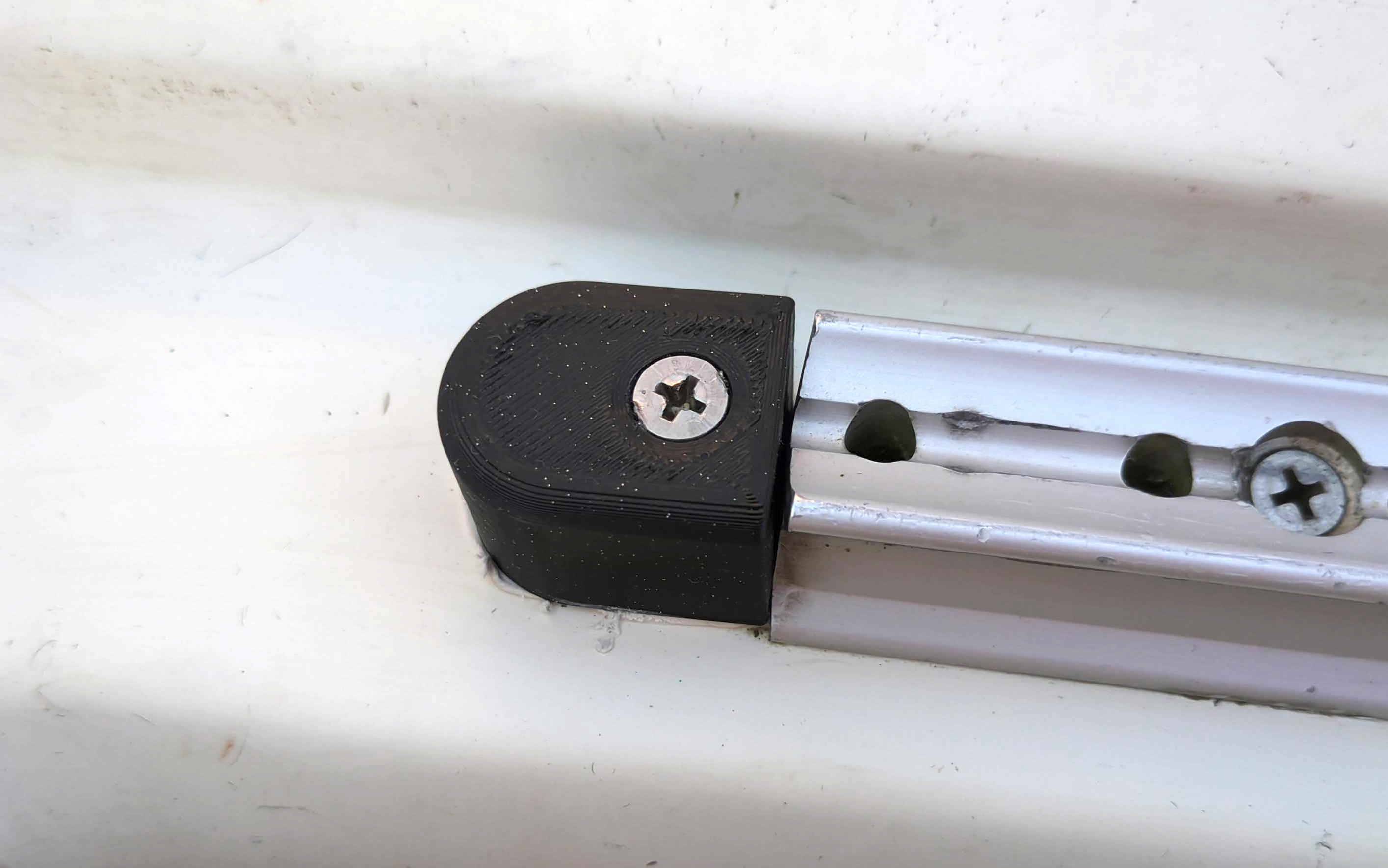 Steve printed them in UV-resistant filament, black with sparkles! Here’s what one of them looks like installed with the original screw and some butyl tape.